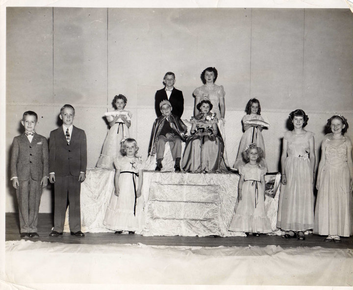 David Sprague with Wayne Lindhorst; crown bearers Cindy Vaughn Provo and Marla Armiger; train carriers included Jennie Bostain. Retiring royalty: Terry Tyner and Barbara Ann Downen. Attendant Judy Green standing beside Brenda Williams.